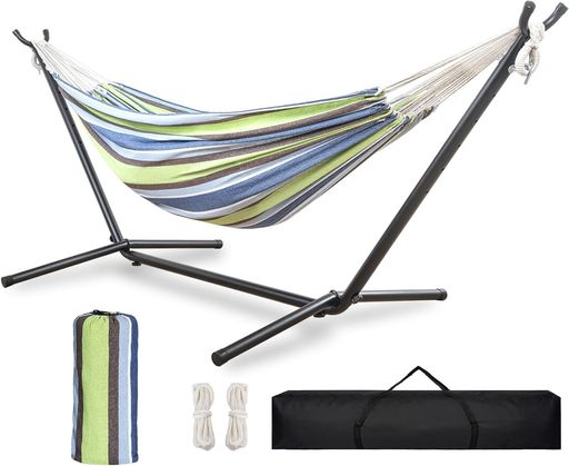 TORIBIOダブルハンモック自立式スタンド耐重荷250kg室内屋外用収納バッグ付きアウトドアキャンプ公園部屋(ブルー)