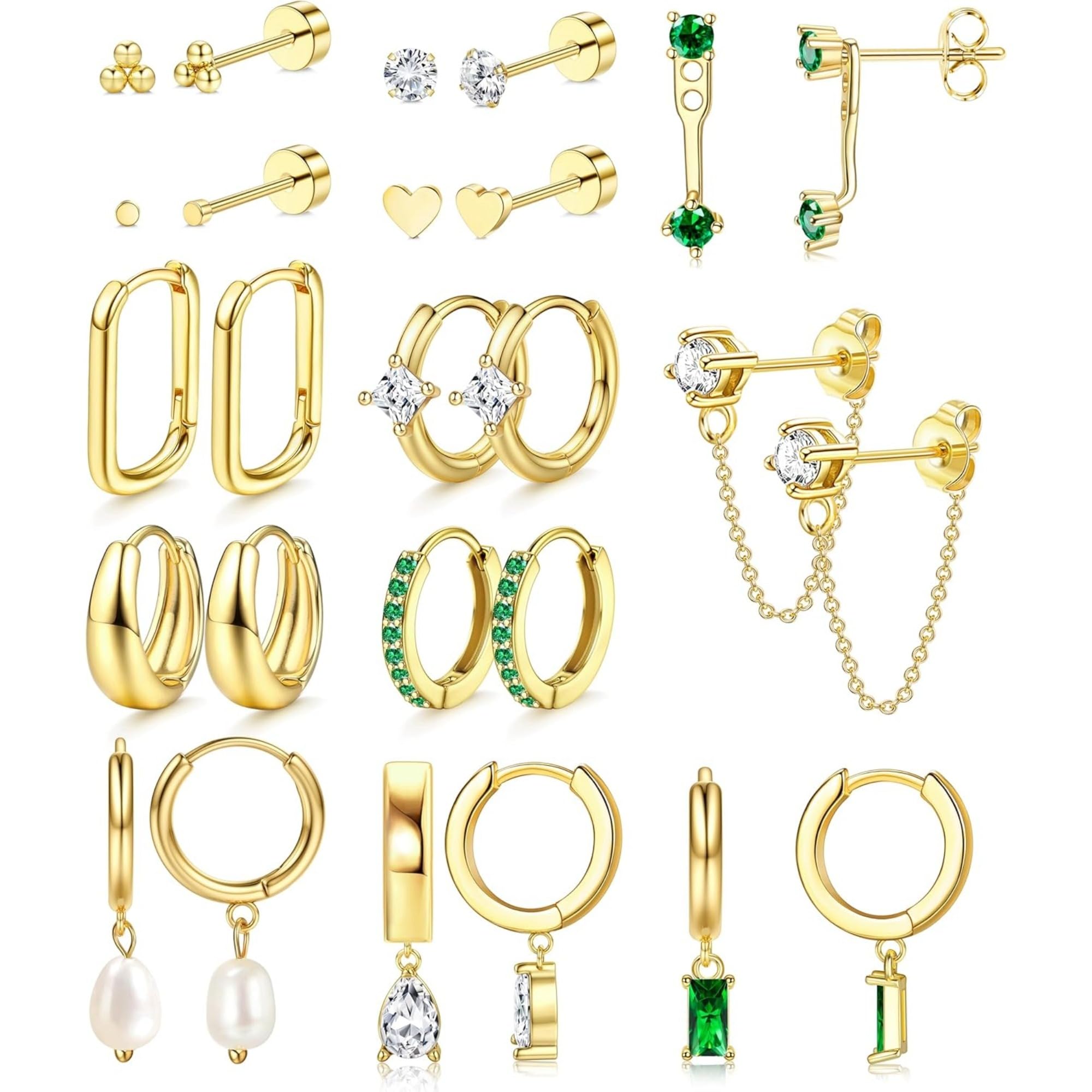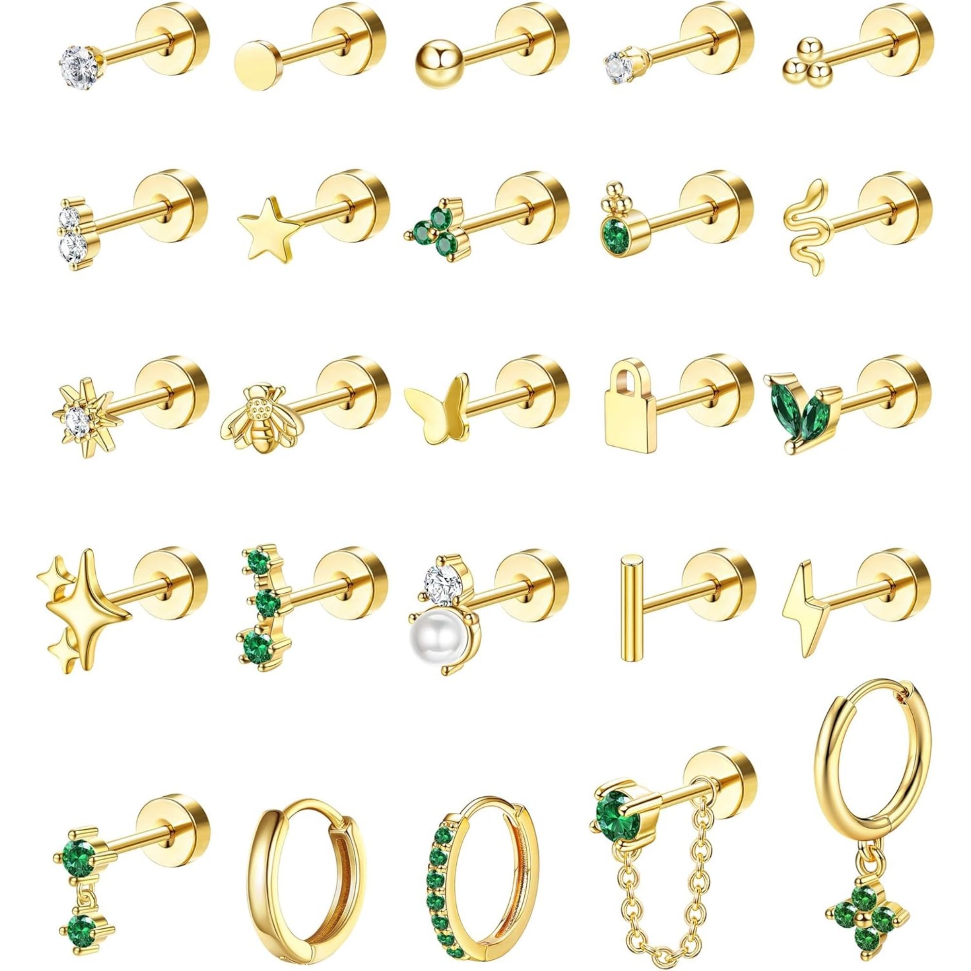 【送料無料】Jstyle 25点 ピアス レディース スタッド ネジ式 ゴールド 小さめ フープ 複数 ヘリックス キュービックジルコニア アレルギー対応 ステンレス 軟骨 女性 ジュエリー 色:エメラルドゴールド、サイズ:通常