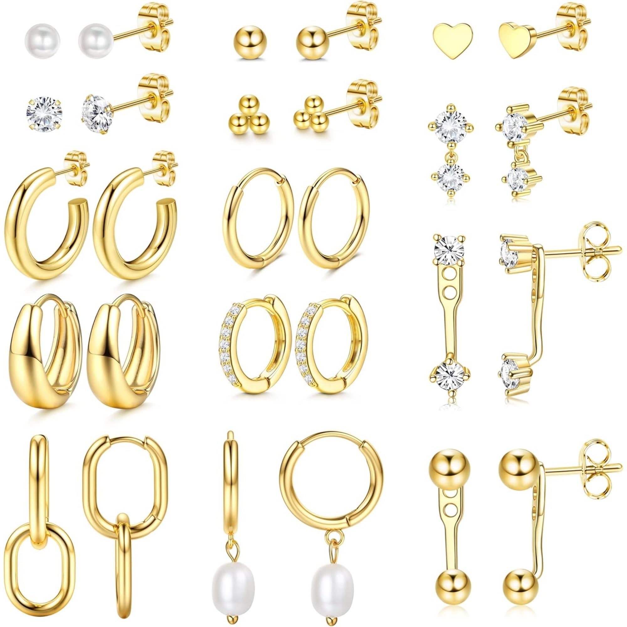 【送料無料】Jstyle 12ペア ピアス セット レディース ゴールド シルバー 組み合わせ スタッドピアス フープ リング 複数 小さめ エメラルド ジルコニア アレルギー対応 ステンレス 軟骨 女性 ジュエリー 色:ゴールド、サイズ:通用