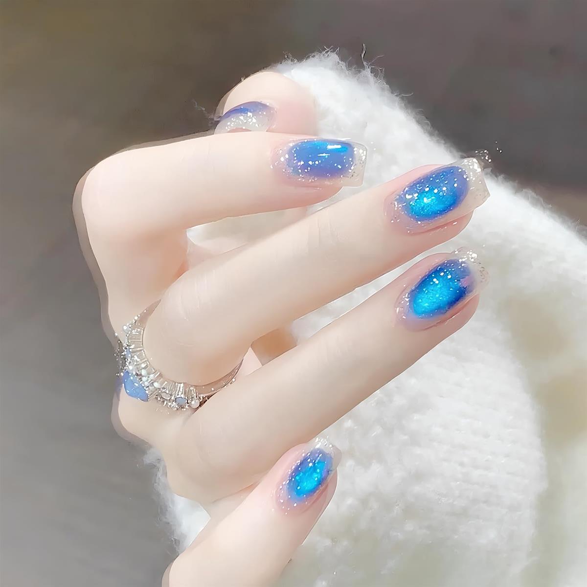 [ALLEVG]ネイルチップ 青30枚入マグネットタイプ 付け爪 ショート猫目石 サファイア ロイヤルブルー 輝き 深み ジェルネイル ジュエリー プレゼント人気 和風 かわいい シンプル おしゃれ 成人式 入学式 結婚式 パーティー 花嫁ネイル