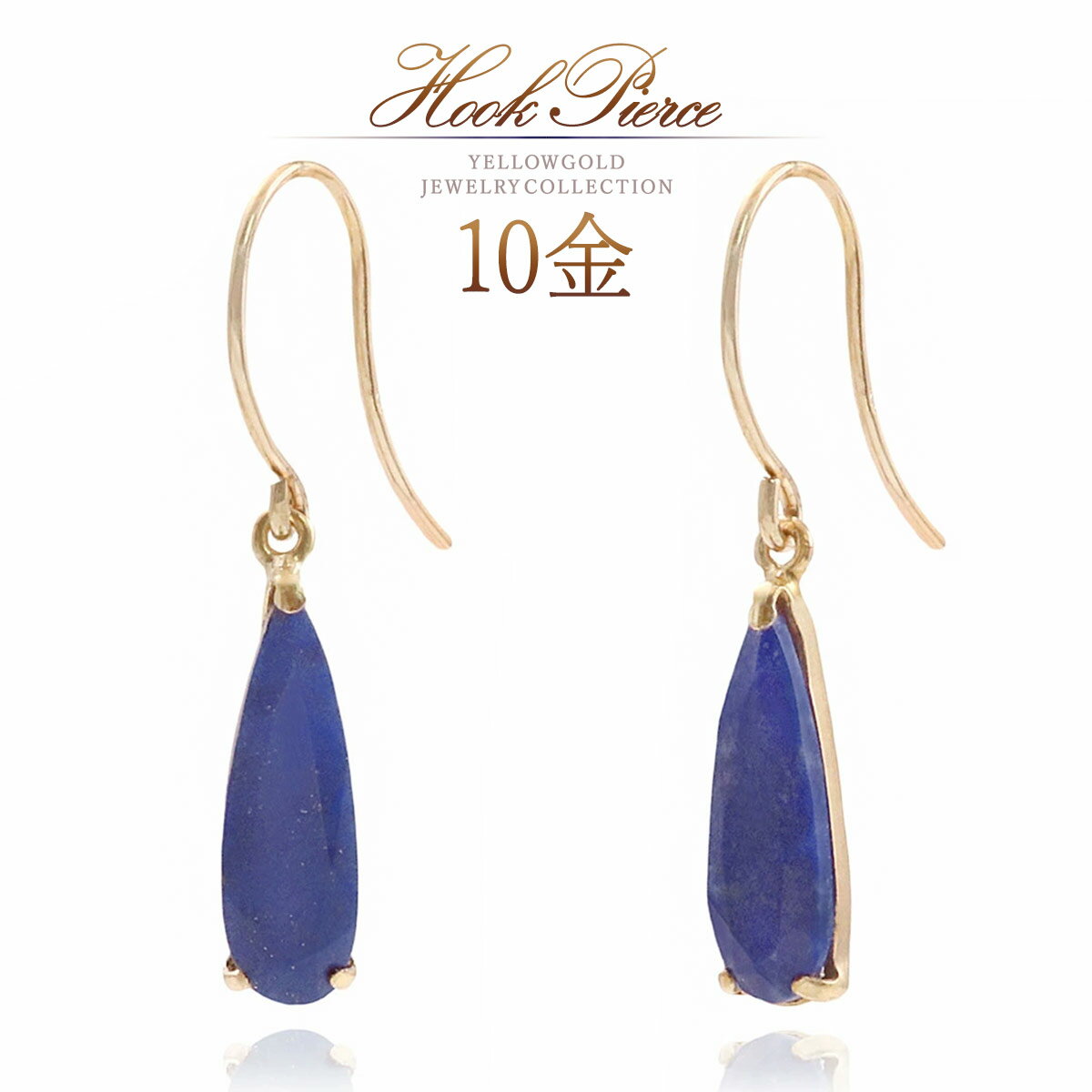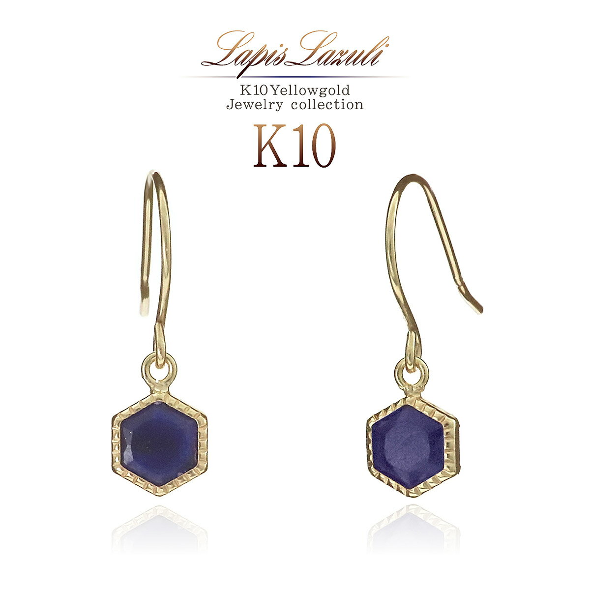 10金 ラピス ラズリ 六角 ピアス K10 小ぶり ゆれる プチ 一粒ピアス 両耳 ゴールド 六角形 小粒 大人 シック 金 ネイビー 紺 濃紺 フック 12月の誕生石