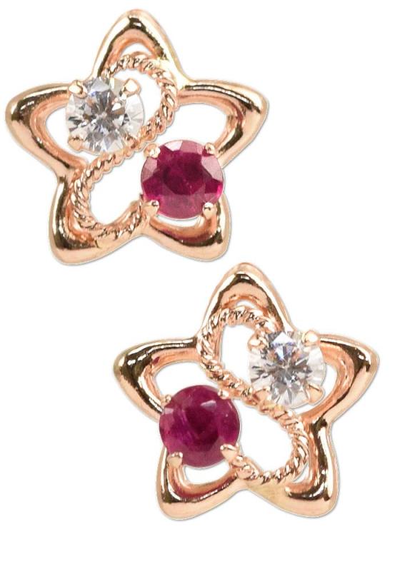 [四葉のクローバー] キュービックジルコニア ルビー 星 ピアス K10 スター 10金 ピンクゴールド 7月 誕生石 10k 華奢 天然石 (両耳用1ペア) レディース 女性 :Kk155