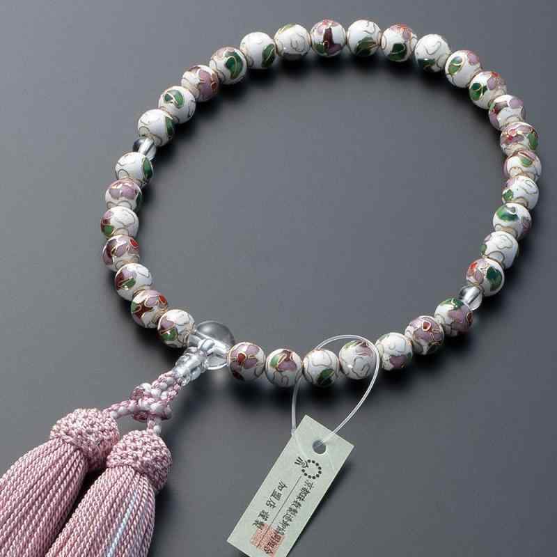 [仏壇屋 滝田商店] 京念珠 数珠 女性用 七宝焼(白) 本水晶仕立 8mm玉 正絹頭付房 数珠袋付き すべての宗派で使える 証明書付