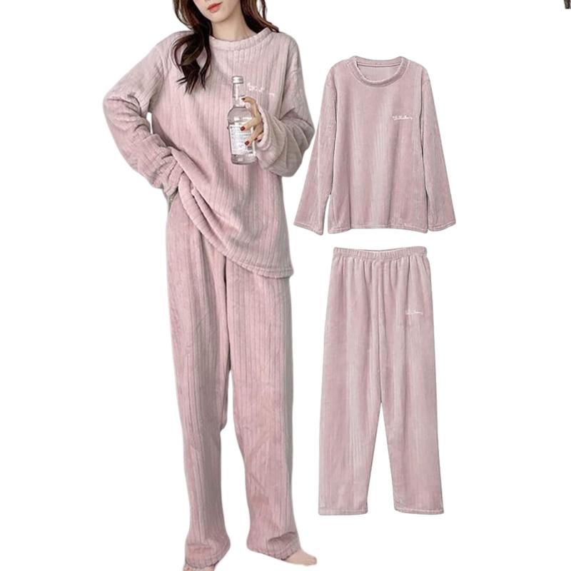 [Tiernyueth] 2点セット ルームウエア レディース ネルパジャマ もこもこ 寝巻き 上下セット パジャマ 無地 丸襟 長袖 部屋着 厚手 保温 トップス ロングパンツ スふわふわ サンゴネル 暖かい 裏