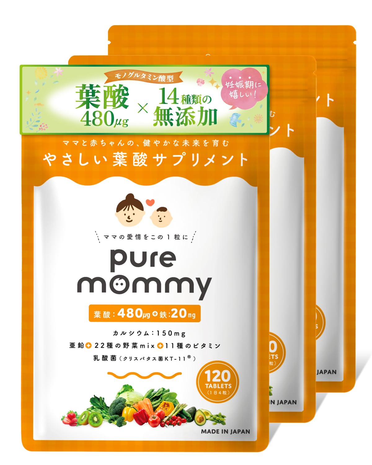【送料無料】ママエールpremium 葉酸 高配合 480μg 妊婦 妊娠 産後 サプリメント 鉄 カルシウム ビタミン10種類 ミネラル7種 和漢成分 亜鉛 国産野菜22種 配合 1か月分