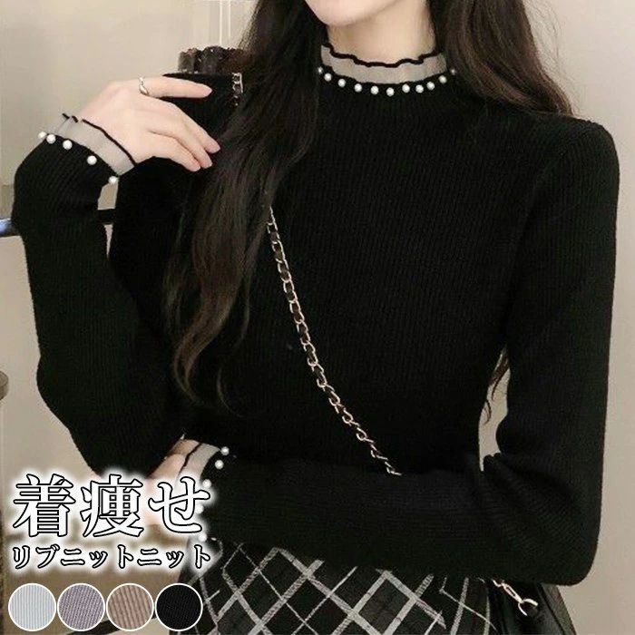 リブニット レディース ニット セーター 長袖 パール袖 トップス