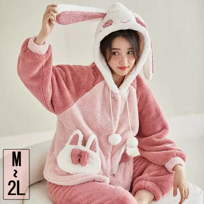 可愛らしいうさぎ耳フード付きで、寒い季節も暖かく過ごせるもこもこパジャマ。ゆったりとした着心地で、リラックスタイムにぴったり。