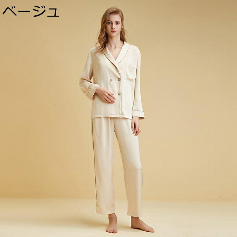 シルク風 パジャマ レディース 長袖 春夏 ルームウェア ナイトウェア 前開き ラペル 上下セット ロングパンツ ランジェリー 滑らか レーヨン 光沢感 シンプル 肌触り 快適 ワイド おしゃれ エレガント
