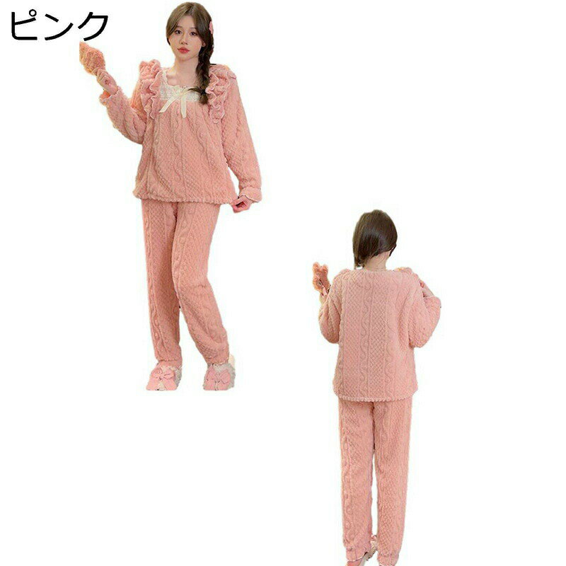 もこもこパジャマ 5XL レディース ルームウェア 婦人パジャマ 姫系 大きい フリル プルオーバー スクエアネック 蝶結び セットアップ 長袖 長ズボン フランネル 秋冬 ふわふわ あったか 柔らか 昼寝着 かわいい