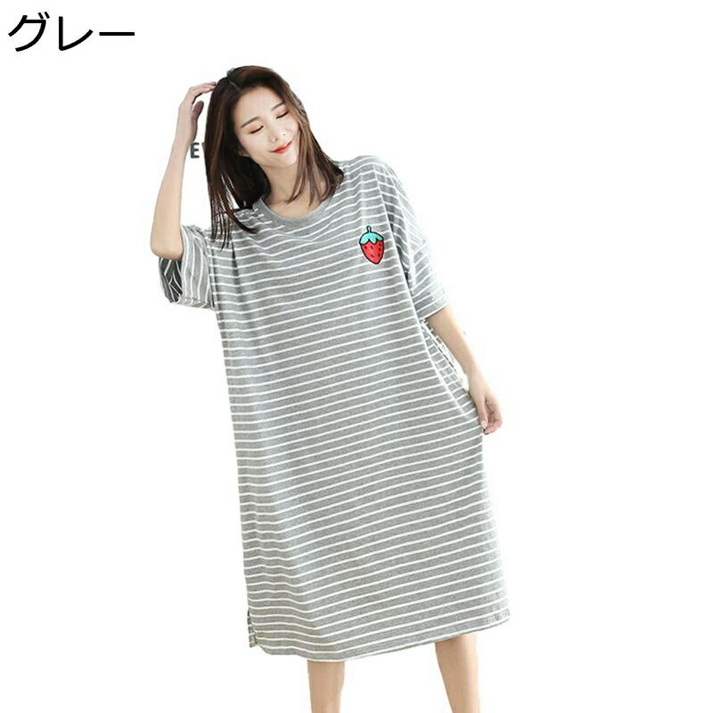 ルームワンピース レディース パジャマ ネグリジェ 綿 ボーダー柄 家着 夏用 半袖 ワイド 大きいサイズ 薄手 通気性 吸湿 肌触り 快適 寝巻き 寝心地の良い お出掛け