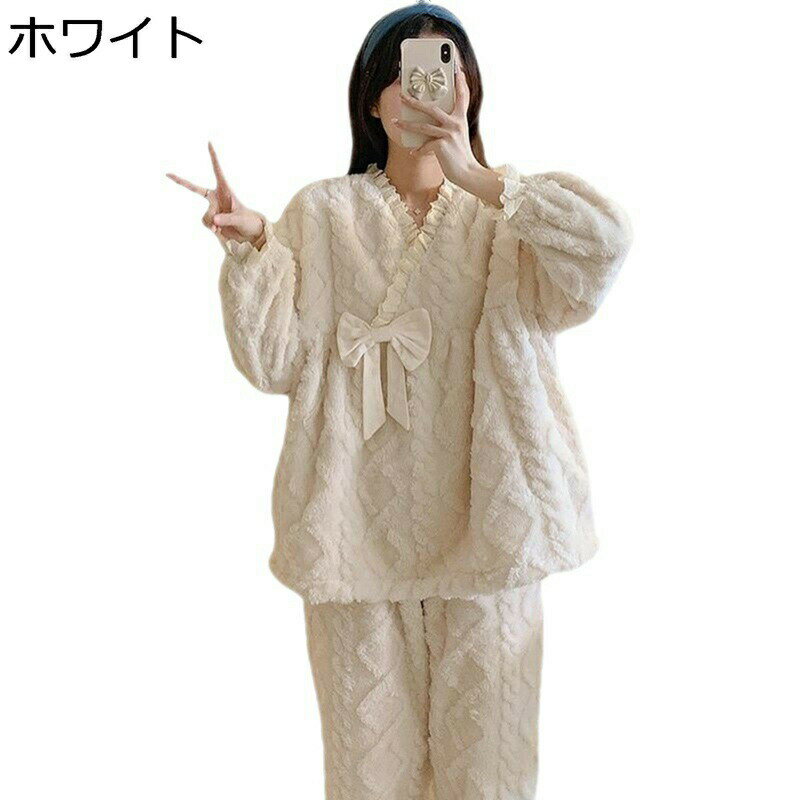 パジャマ 甚平 リボン フリル 秋冬着 4xl レディース 大きいサイズ 寝間着 ルームウェア 2点セット フランネル 裹起毛 防寒保温 暖かい 可愛い 日系 和風 姫系 無地 冷え対策 ガールズ 誕生日