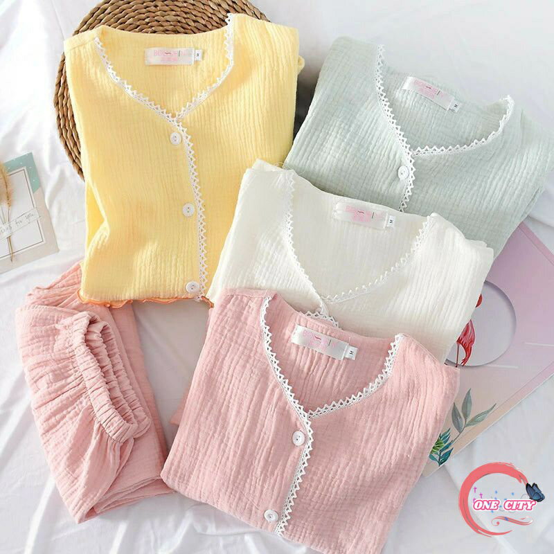 【送料無料】プレゼント ギフト 寝間着 夏 ペアパジャマ 無地 前開き 上下セット 綿 ダブルガーゼ 長ズボン 長袖 寝巻き ルームウェア
