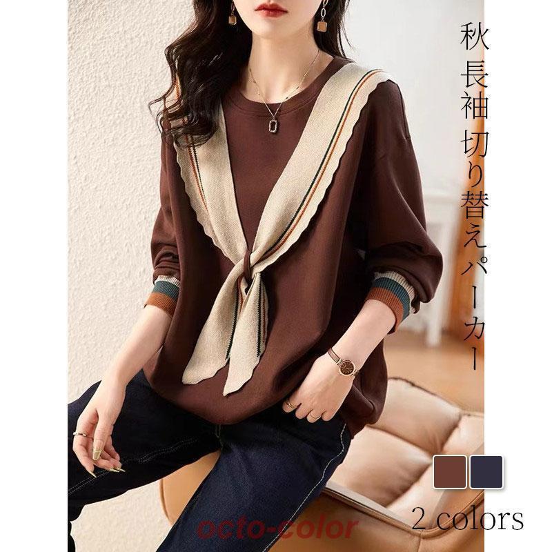 レディース 40代 秋 長袖 切り替えトップス プルオーバーパーカー カジュアル 大きいサイズ 着痩せ 韓国風 通勤 通学 30代 50代