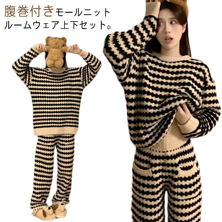 あったかモールニット素材のルームウェア上下セット ボトムスは腹巻付きなのでお腹の冷え対策に 締め付けない マシュマロ 着る毛布 温活 部屋着