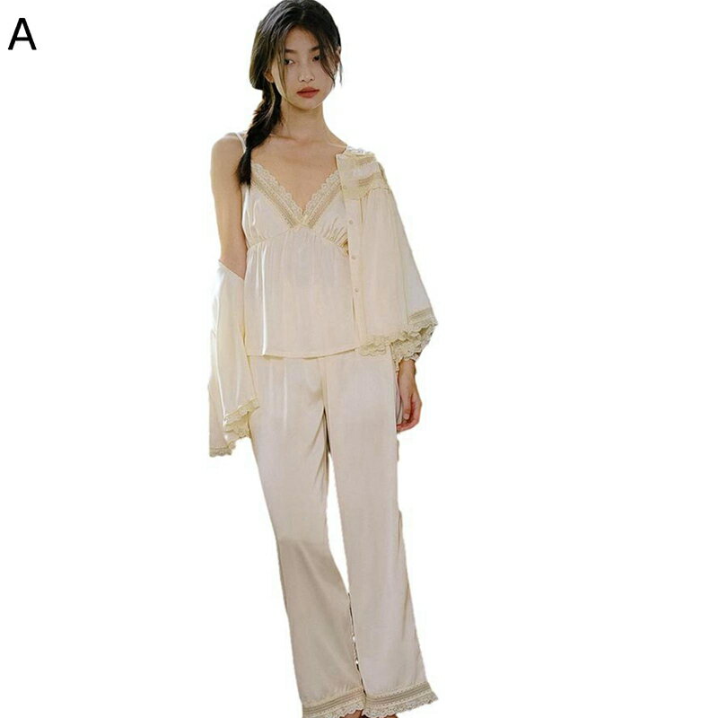 パジャマ レディース 3点セット ナイトウェア 部屋着 ルームウェア 長袖ブラウス ベスト ロングパンツ フリル セクシー リボン フリル レース 薄手 エレガント 四季適用 お風呂上り 温泉着 快適