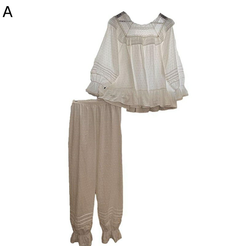 パジャマ レディース 上下セット 2点 ベージュ ヴィンテージ 宮廷風 ゆったり ボリューム袖 長袖 ロングパンツ コットン100 綿 部屋着 寝間着 便利服 吸汗 通気 肌に優しい 柔らかい 可愛い 春 夏 秋