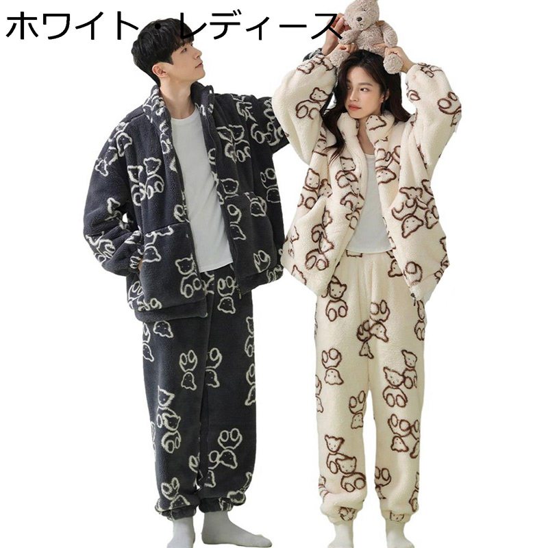 ペアパジャマ クマ柄 ルームウェア 2点セット メンズ レディース ジップアップ ボアジャケット パーカー 便利服 部屋着 秋 冬 フランネル 両面起毛 前開き 韓国風 リラックス カジュアル 可愛い 男性 女性