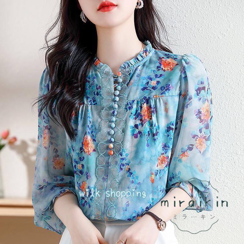 シフォンチュニック 花柄ブラウス ボタニカル柄 レースリーフ レディース トップス 春夏 新作 カジュアル服 カジュアル 女性らしい トレンド ファッション