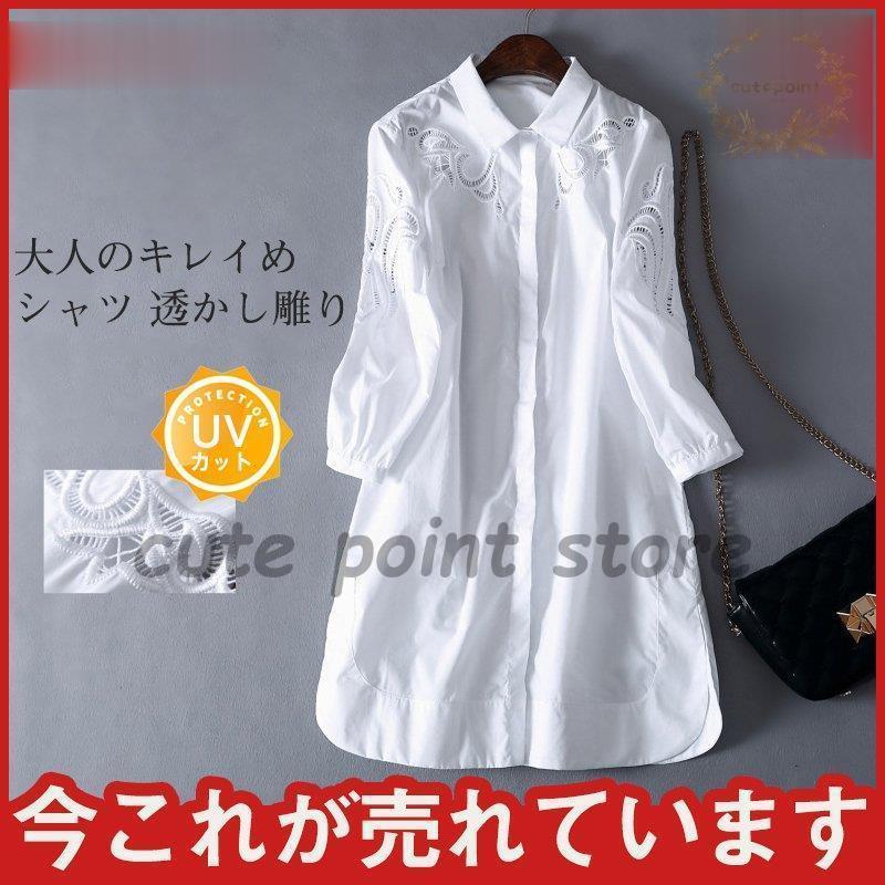 シャツ レディース ロングシャツワンピース 日焼けとめ ワイシャツ 透かし雕り 体型カバー 長袖 夏 チュニック 着痩せ トップス おしゃれ