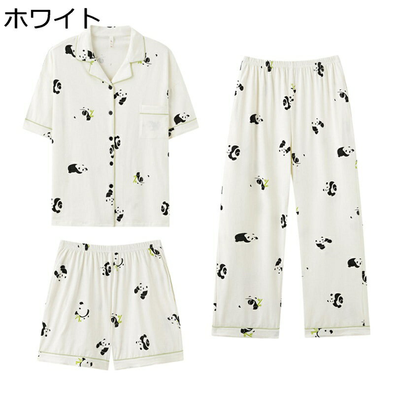 レディース パジャマ 三点セット 部屋着 夏用 コットン 半袖 ショーパン 長ズボン 薄手 通気 吸湿性 肌触り 快適 ナイトウェア 上下セット パンダ柄 トラベル お泊り ワイド カジュアル