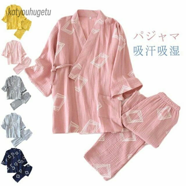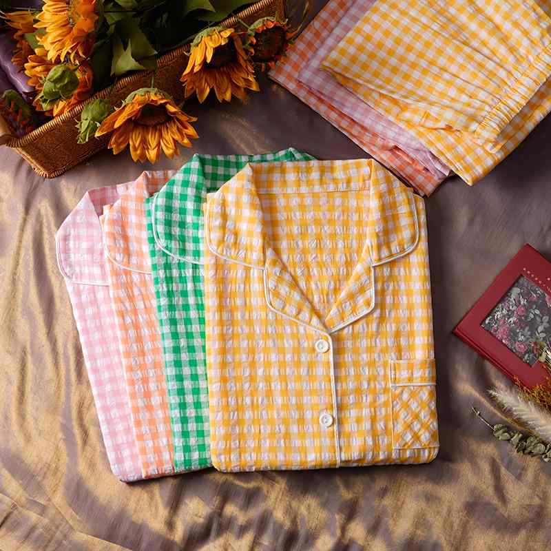 日本風 夏 涼感 冷感 ひんやり サッカー生地 楊柳 パジャマ 寝間着 レディース 女性用 婦人 薄手 半袖 ショートスリーブ 長ズボン ロングパンツ チェック柄 格子柄 外出可 部屋着 ルームウェア ホームウェア 上下セット 春 秋