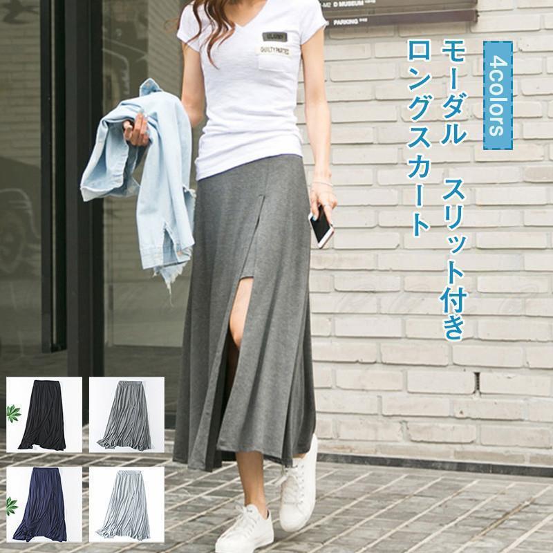 ロングスカート レディース 無地 スリット付き モーダル ボトムス カジュアル ハイウエスト ウエストゴム インナーパンツ付き 美脚 きれいめ