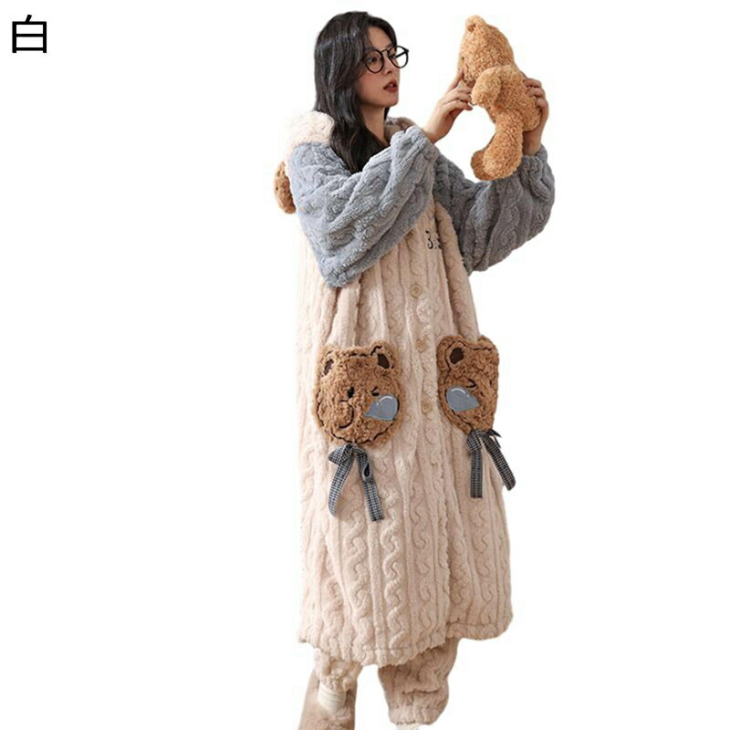 ルームウェア パジャマ レディース 上下set ロングガウン 可愛い熊柄 バスローブ 寝巻き フランネル 編み込み風 両面起毛 暖かい 厚い ふわもこ ぱじゃま 便利服 快適 秋冬向き 結婚祝い