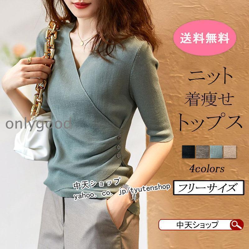トップス レディース 春夏秋 ニットトップス ニット50代ファッションプルオーバー vネック 五分袖 オシャレ カジュアル フェミニン 新作 大人 通勤秋服 4色