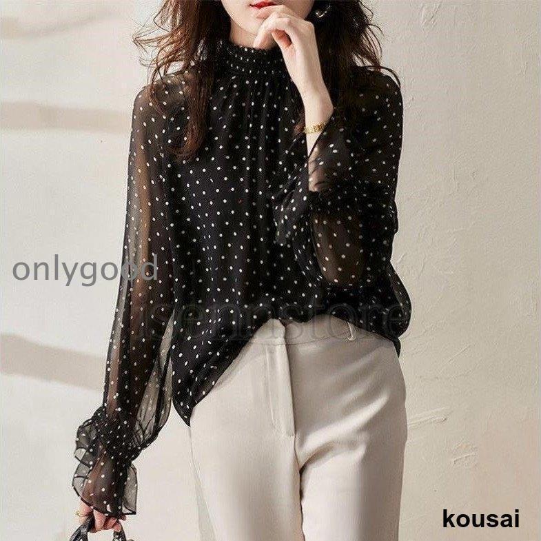 ドット柄ブラウス シースルー 袖透け感 レディース 秋 トップス シャツブラウス 水玉 プルオーバー長袖 ブラウス ゆる 体型カバー きれいめ 通勤OL