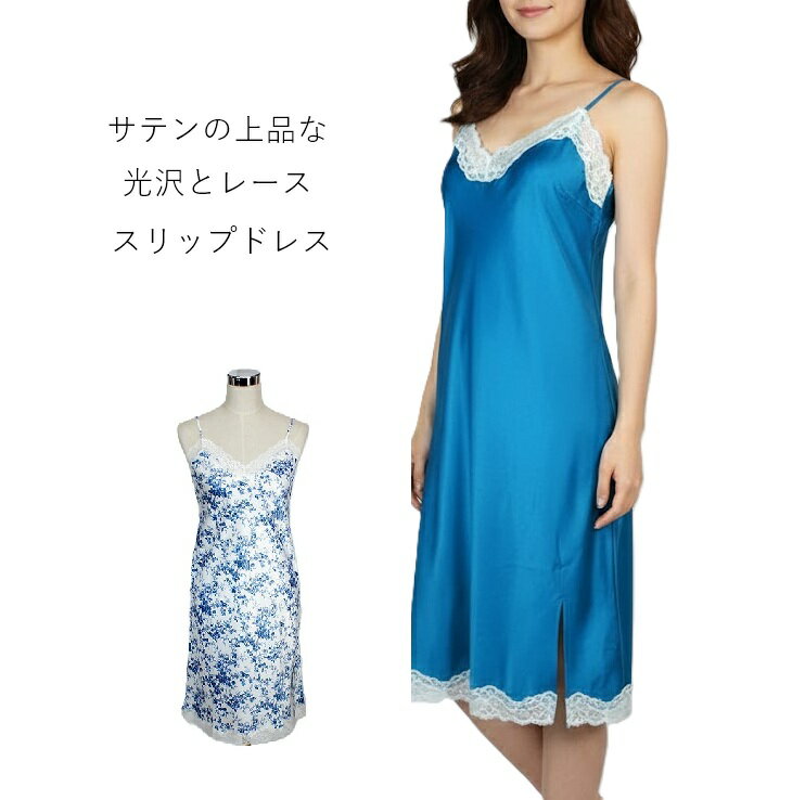 【半額セール】サテンの上品な光沢とレース 静電防止 サテンスリップ ロング丈 ナイトドレス(S|M)グリーン・オフ白/鳥