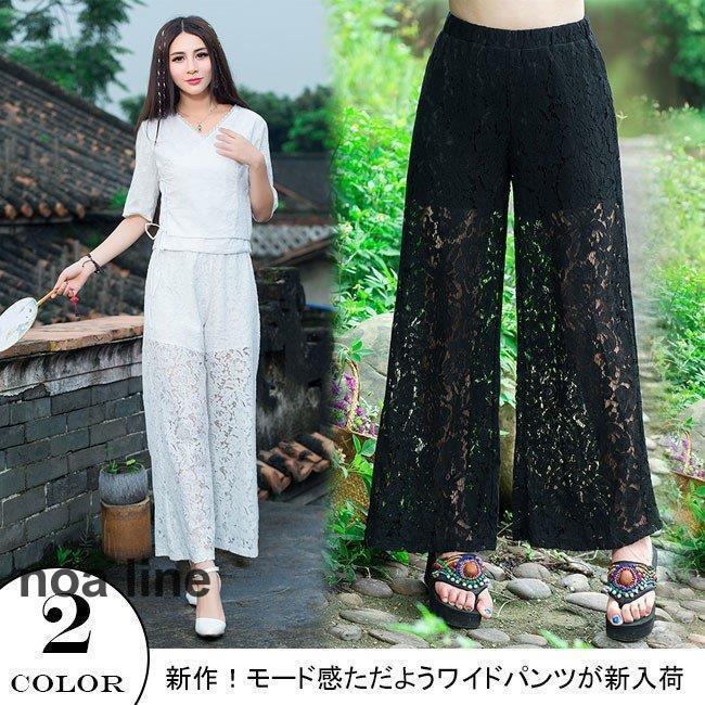 レディースガウチョパンツ ワイドパンツ レース 透かし トレンドアイテム ズボン ボトムス おしゃれ 春秋