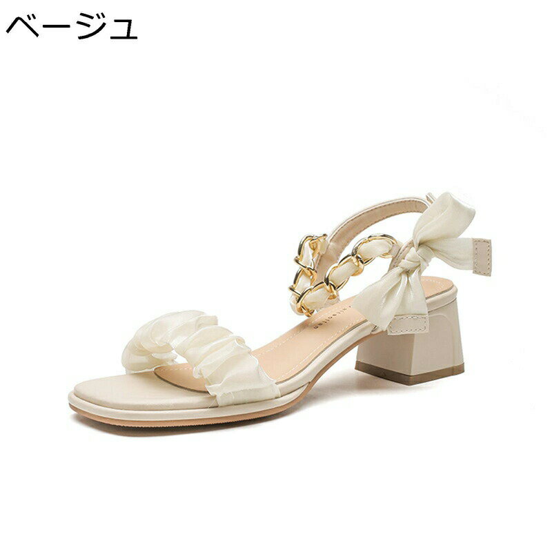 サンダル レザー 本革 蝶結び 甲ストラップ メタリック シルク チェーン 金属 リボン ミドルヒール レディース 日常 スクエアトゥ 冠婚葬祭 粗いかかと 通気性 歩きやすい フェミニン 夏靴