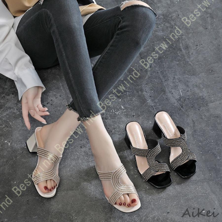 ミュール レディース 歩きやすい サンダル パール付き キラキラ おしゃれ 夏 ミュールサンダル ミドルヒール 太ヒール 5.5センチ 安定感 美脚サンダル サボ