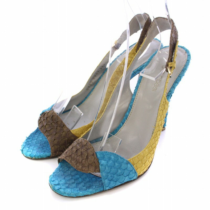 【中古】セルジオロッシ Sergio rossi ストラップサンダル ラウンドトゥ ハイヒール 切替 37.5 青 ブルー 黄色 イエロー チャコールグ