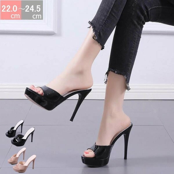 送料無料 ハイヒール エナメル質ミュール サンダル 黒 レディー