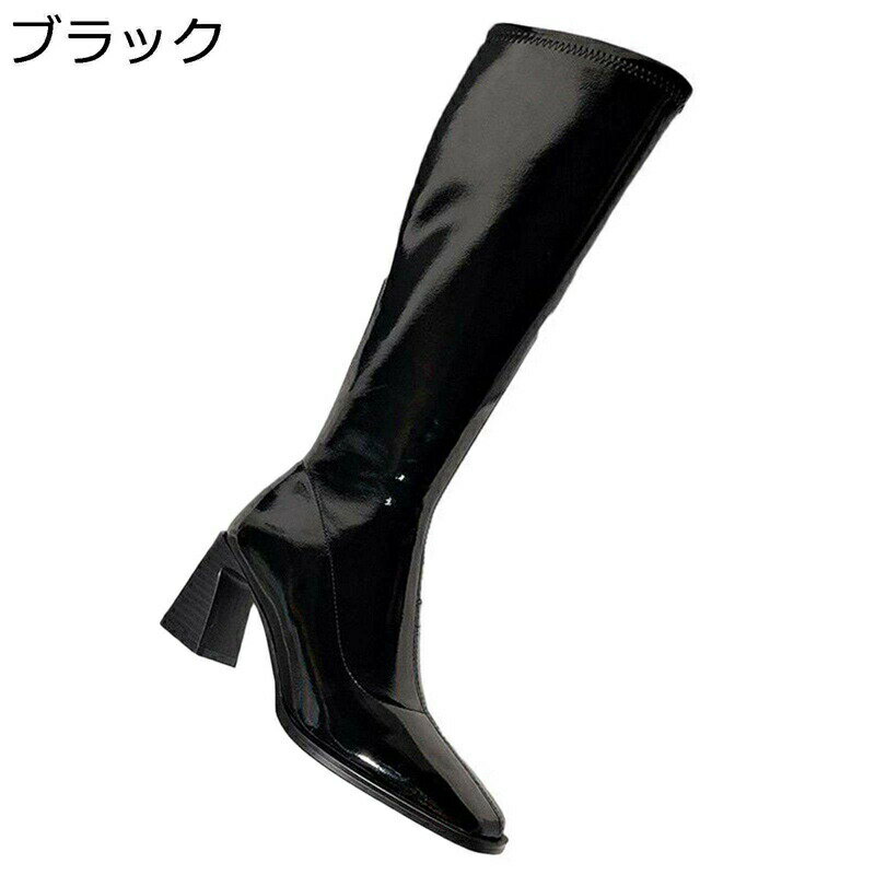 ブーツ レディース ニーハイブーツ エナメル ロング丈 ストレッチブーツ 高筒 スクエアトゥ サイドジップ チャンキーヒール 7CMヒール 着脱簡単 脱がない 秋冬 ライダース セクシー モード