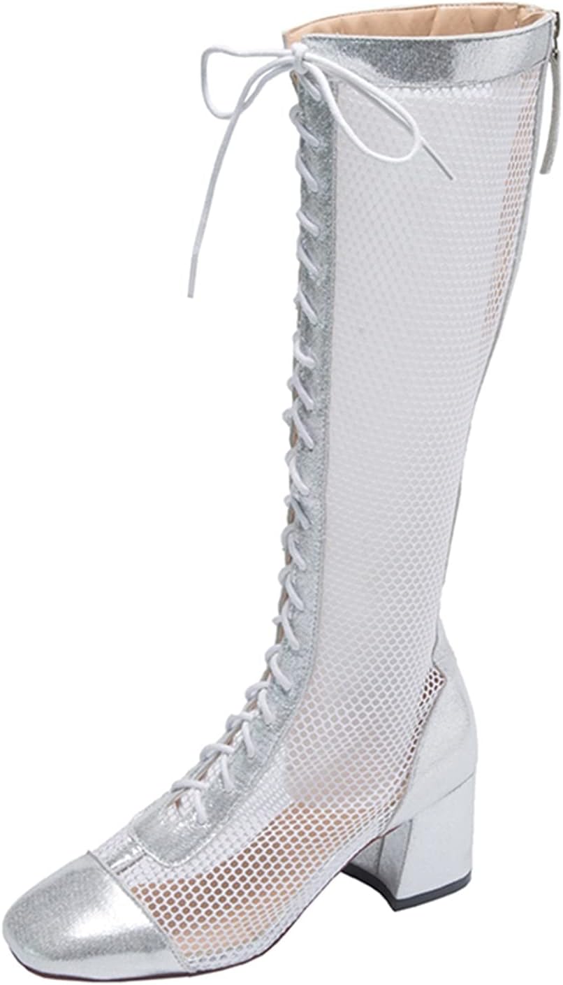 【20%OFFクーポン〜】ストレッチブーツ ハイヒール6cm 夏用ブーツ メッシュ スクエアトゥ レディース ロングブーツ レースアップ セクシー 身長アップ 女子力 通気孔 ファッション 細見え アプリコット ブラック シル