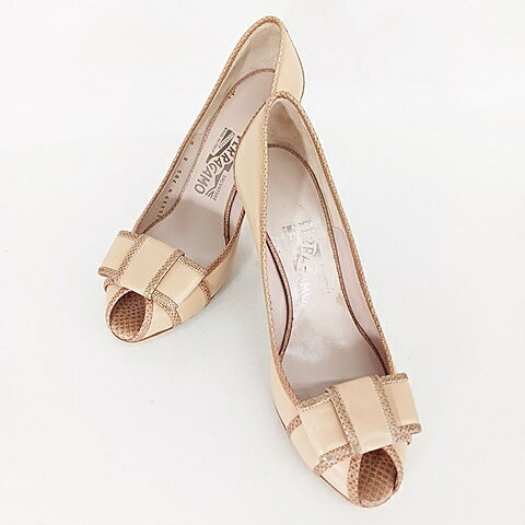 【中古】サルヴァトーレフェラガモ Salvatore Ferragamo パンプス オープントゥ リボン レザー パイソン ベージュ ブラウン 茶 6D レデ