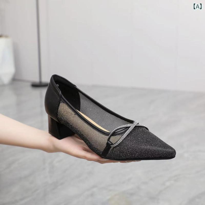 レディース パンプス フレンチスタイル ポインテッドトゥ メッシュ チャンキーヒール 水晶 装飾 エレガント ベーシック 通勤用 普段使い 高級感 ヒールシューズ