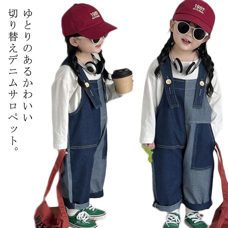 送料無料 デニム サロペット 子供服 切り替え 女の子 男の子 デニムサロペット ジュニア デニムオーバーオール ロングパンツ 春 秋 かわいい 韓国子供服