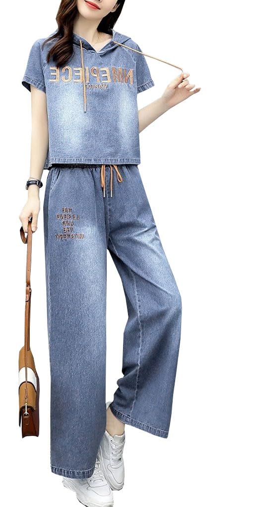 【送料無料】[DYIOPMFGZ] セットアップ レディース 2点セット デニムズボン パンツ ワイドパンツ 上下セット Tシャツ デニムトップス ジーンズ カットソー カジュアル 可愛い ゆったり ロング丈 通勤 着痩せ 半袖 色:コーヒー、サイズ:M