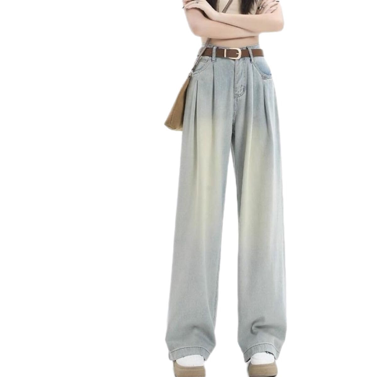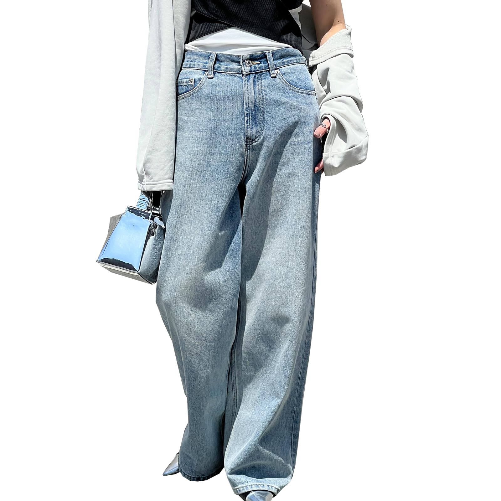 【送料無料】[ZeoYoee] デニムパンツ レディース ワイドパンツ ジーンズ 無地 ストレート ハイウエスト ズボン 体型カバー おしゃれ 美脚 着痩せ 通勤 普段着 春 夏 秋 色:ブルー、サイズ:M