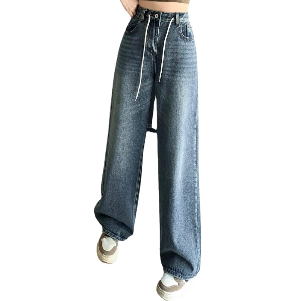 【送料無料】[KEQIKAI] レディース ゆったり ジーンズ 柔らかい ワイドパンツ ジーンズ デニム レディース 大きいサイズ ゆったりパンツ ウエストゴム 巾着 美脚 大きいサイズ 色:ブルー、サイズ:M