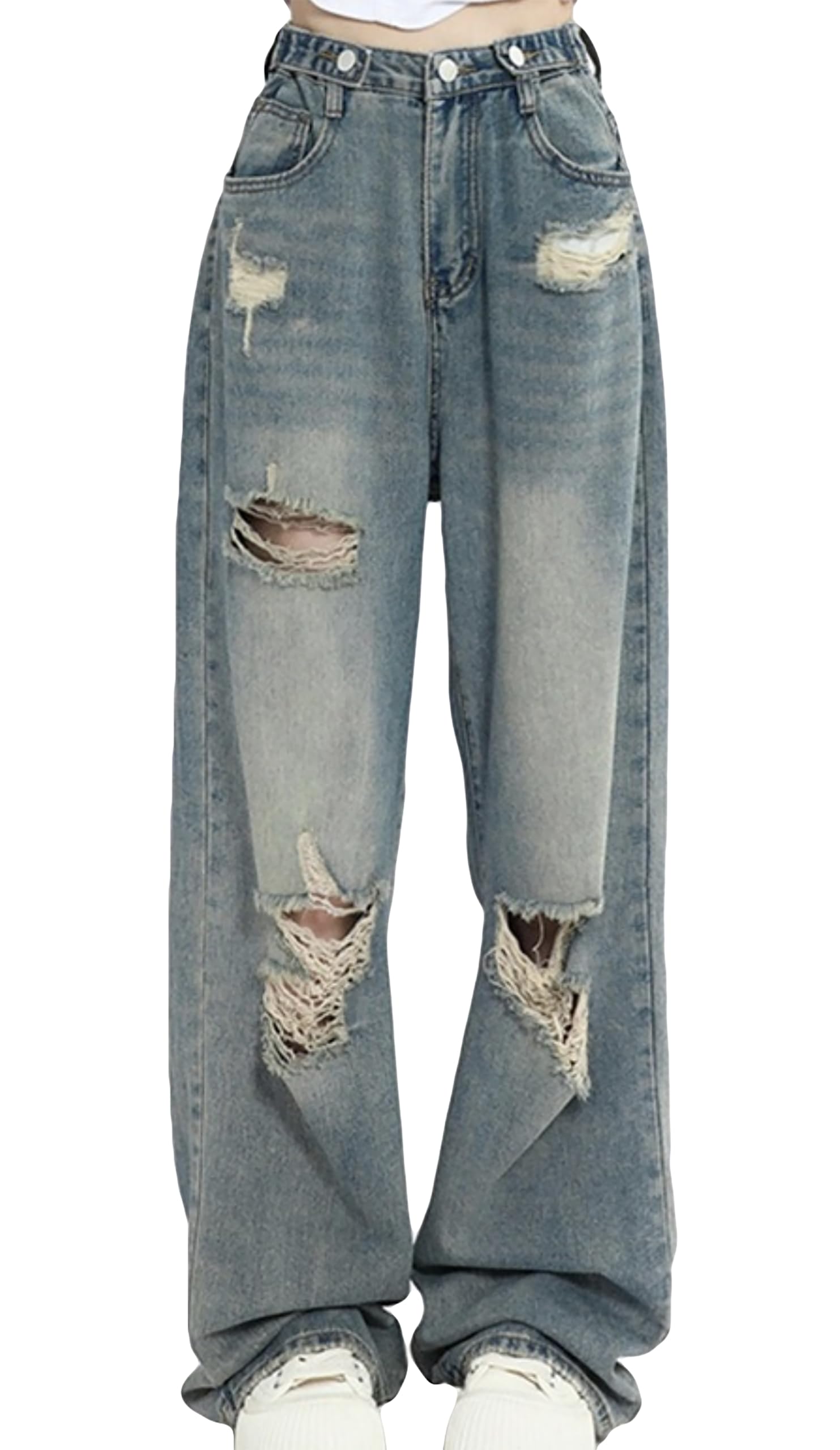【送料無料】[MMTYRM] ジーンズ レディース デニム ロング パンツ ゆったり ワイドパンツ ストレッチ ダメージジーンズ ハイウエスト ロングパンツ gパン レディース デニム ストレット パンツ 色:ブルー、サイズ:S