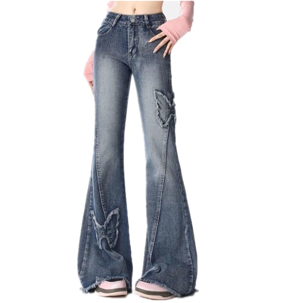 【送料無料】[KKAERDIYA] バタフライ刺しゅうフレアデニムパンツ レディース 色:ブルー、サイズ:L