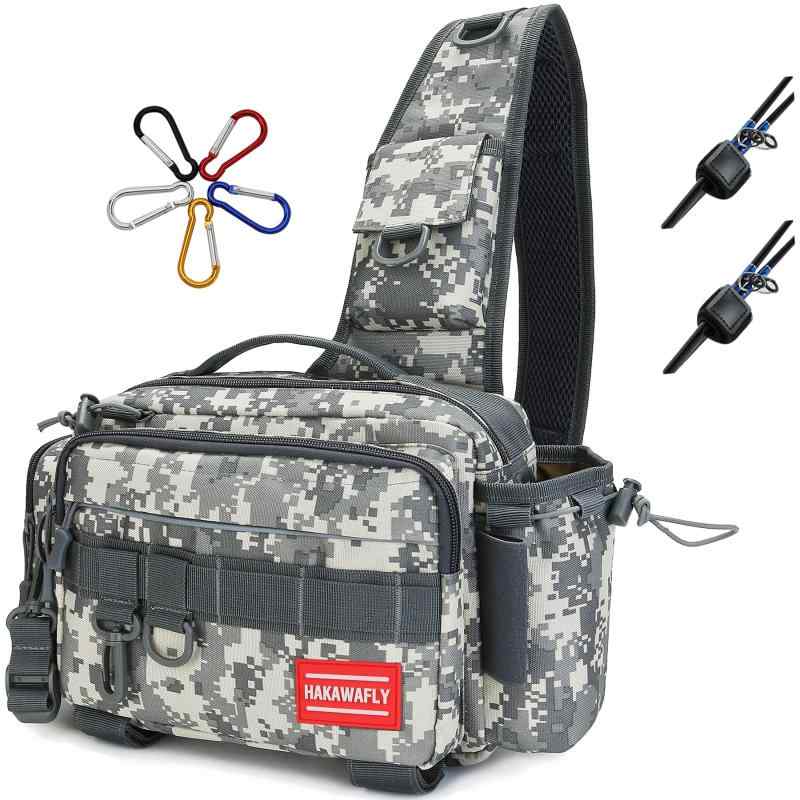 フィッシングバッグAY ロッドベルト2点とカラビナ5点付き 釣りバッグ 防水 タックルバッグ 多機能 大容量 ランガンバッグ (グレーカモフラージュ)