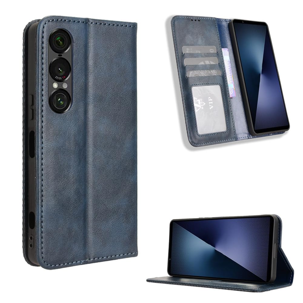対応 Xperia 1 VII ケース 手帳型 手帳型ケース カバー 手帳型 PUレザー カード収納 財布型 軽量 耐衝撃 ケース マグネット スマホケース 横置き機能 (ダークブルー)