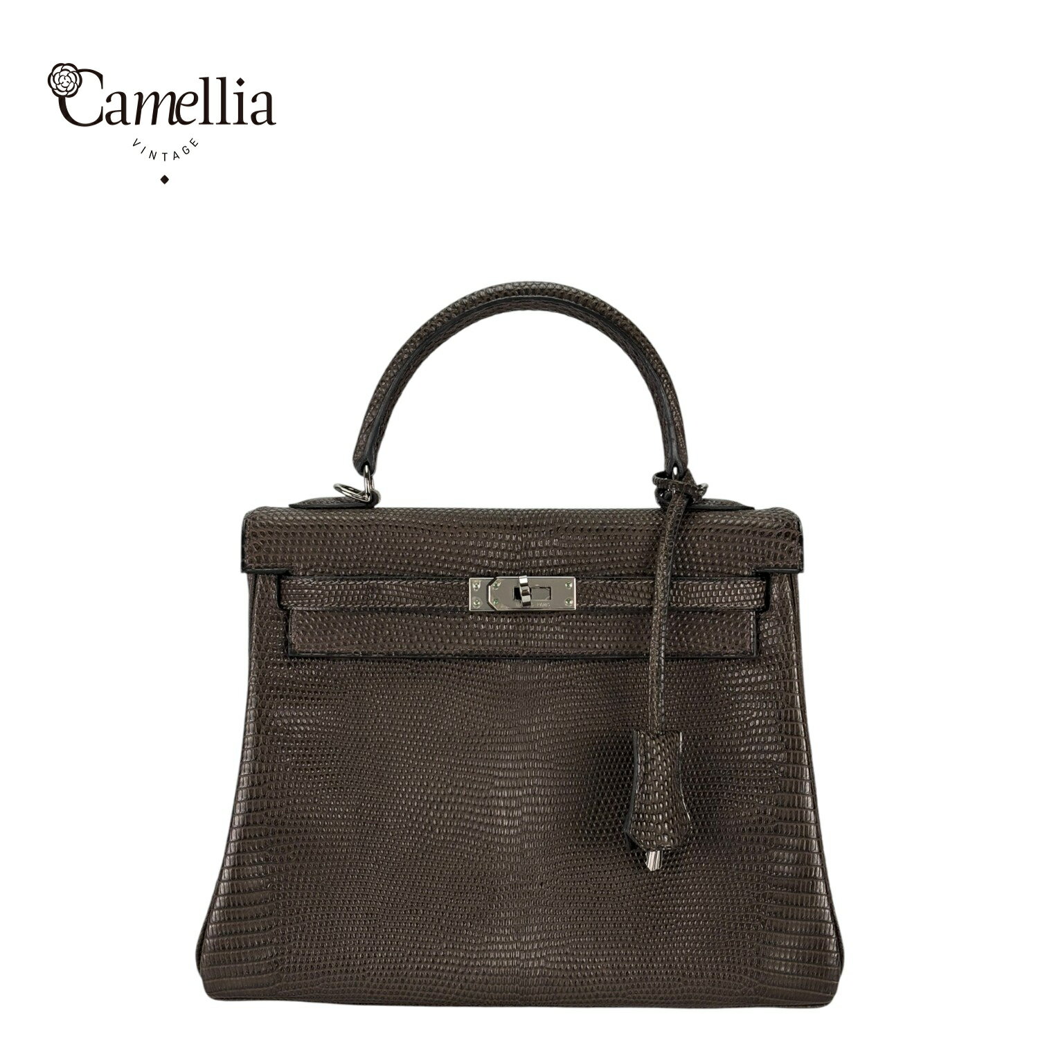 Camellia HERMES エルメス ケリー25 Kelly ハンドバッグ 2way ショルダーバッグ リザード 46 Ebeneエベーヌ 口I刻印 2005 ルテニウム金具【中古】