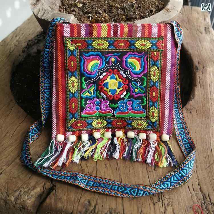 エスニック ショルダーバッグ かばん 刺繍 クロス ボディ 斜めかけ 個性 民族風 布 キャンバス コンパクト ミニ レディース 赤 緑