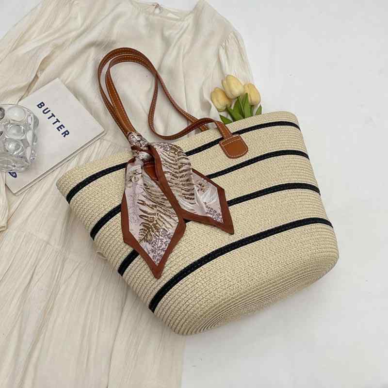 夏 バッグ レディース かご 大容量 草 編み ショルダー ビーチ 通勤 ショッピング ジッパー 開閉 裏地 内ポケット 立体 自立型 ストライプ柄 アイボリー ブラウン カーキ